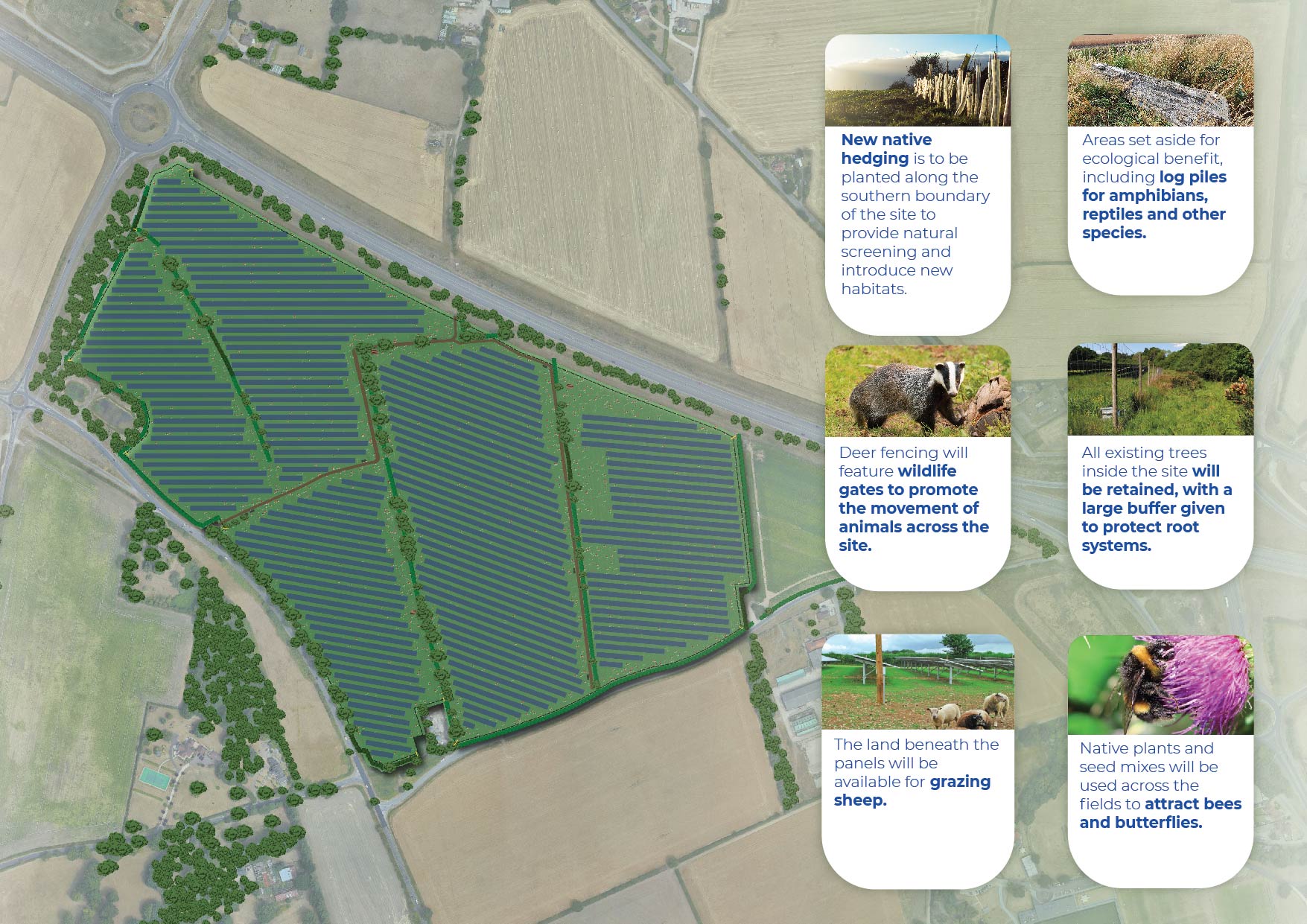 Solar farms take up a very small proportion of the land they occupy, leaving huge scope for biodiversity. Research has shown they improve the diversity and abundance of broad-leaved plants, grasses, butterflies, bumblebees and birds, including those with conservation status. Details of the enhancements we will provide can be found in the graphic, and we would welcome your comments on this.