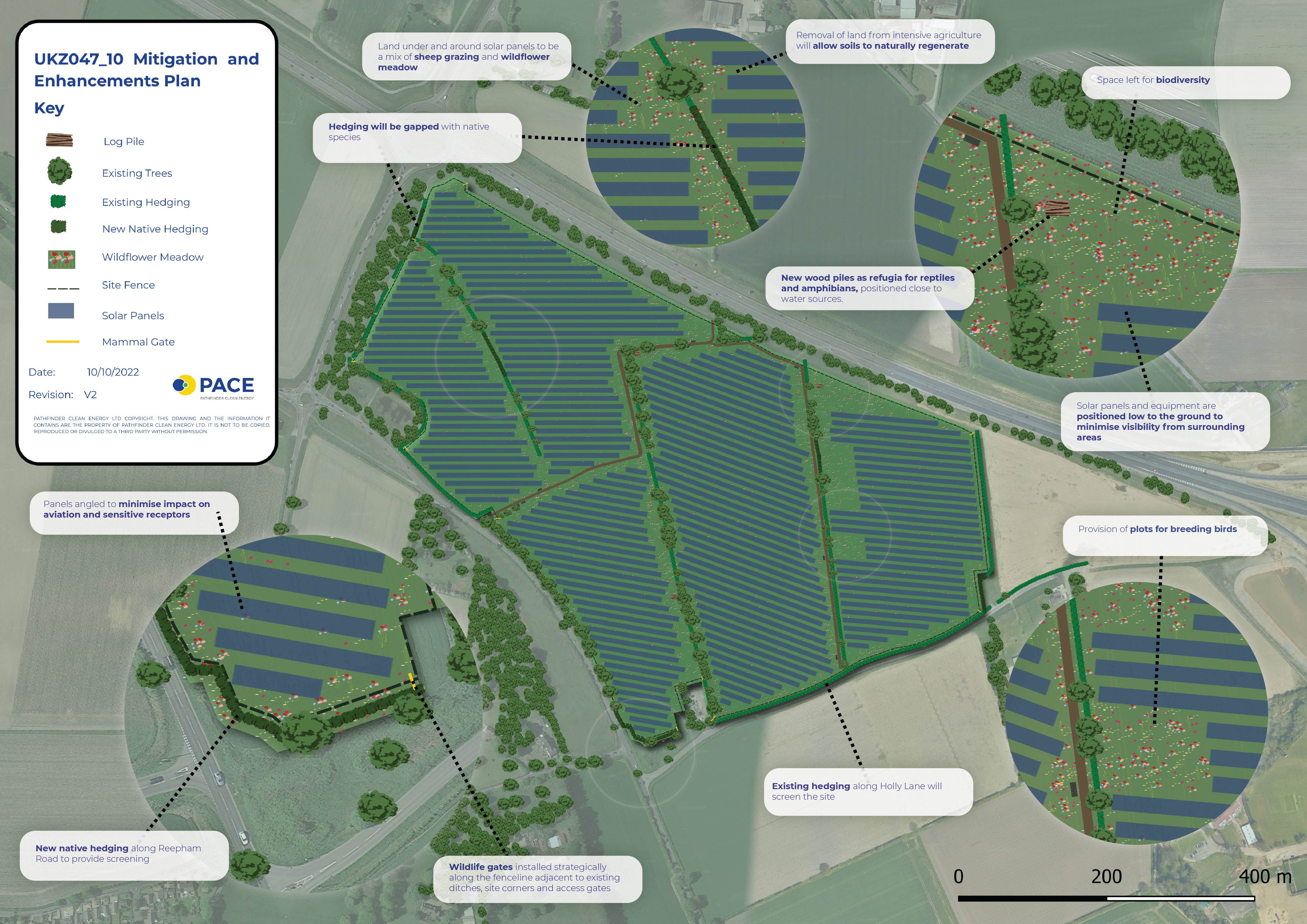 Solar farms take up a very small proportion of the land they occupy, leaving huge scope for biodiversity. Research has shown they improve the diversity and abundance of broad-leaved plants, grasses, butterflies, bumblebees and birds, including those with conservation status. Details of the enhancements we will provide can be found in the graphic, and we would welcome your comments on this.